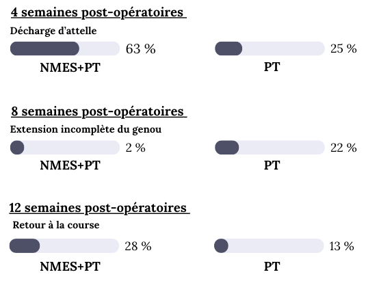 Impact clinique : L'ajout de la NMES aux exercices traditionnels permet une stimulation ciblée des fibres musculaires, favorisant un renforcement musculaire plus rapide et plus efficace. Des études ont démontré que cette approche combinée conduit à des progrès plus rapides par rapport à un protocole sans stimulation électrique.